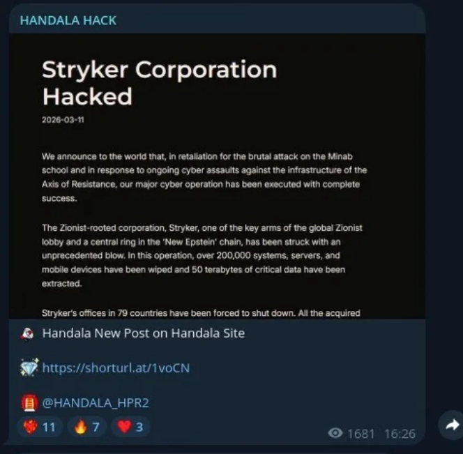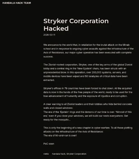 On March 11, 2026, Handala claimed responsibility for a destructive cyber operation against Stryker, a Fortune 500 medical technology company.